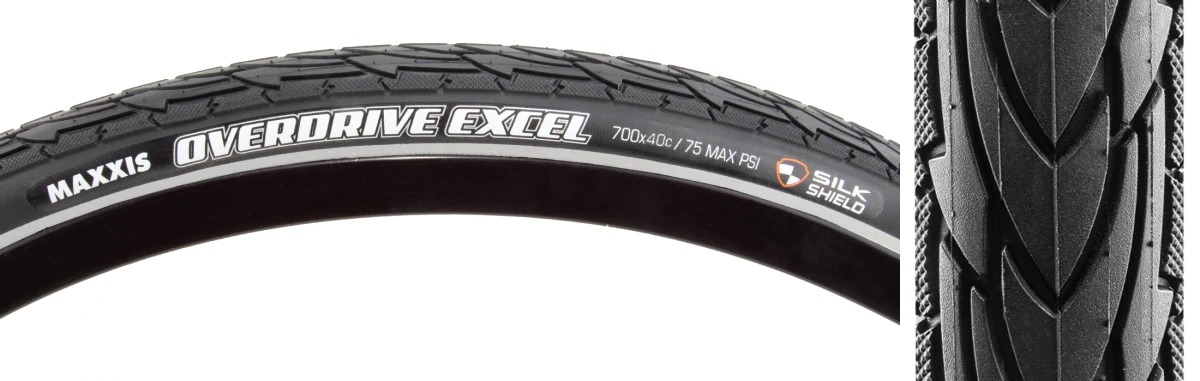 Maxxis Overdrive Excel - надежная и прочная покрышка для городских велосипедов. Модель с равномерно расположенными шипами, имеет специальный слой SILKSHIELD для обеспечения защиты от проколов. Отличная резина по доступной цене.